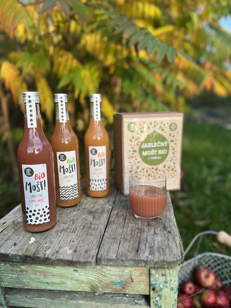 Čistý jablkový mušt z eko sadov v Bielych Karpatoch a sladučké malinové pyré.