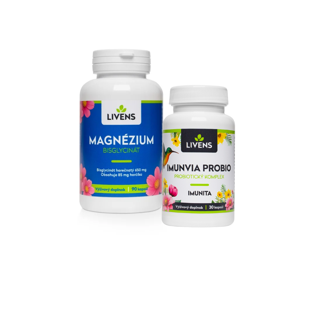 - Imunita a Trávenie (Imunvia Probio): Komplex 6 kmeňov probiotík s Vitamínom C na podporu zdravej črevnej mikroflóry. Zdravé črevá sú základom silnej imunity a lepšieho vstrebávania magnézia.